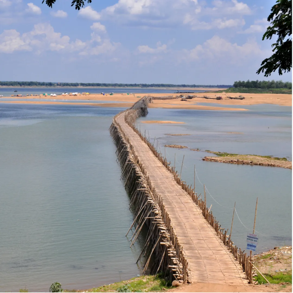 Embark on your cycling journey, riding along the banks of the mighty Mekong River. Experience the vibrant energy of Phnom Penh as you cycle through the city and out into the surrounding countryside, where the landscape opens up to reveal the true beauty of rural Cambodia. As you ride, you’ll witness the daily lives of farmers who rely on the fertile Mekong Delta, observing their traditional farming practices and gaining a glimpse into their deep connection to the river. The route follows the river’s course, offering picturesque scenery and glimpses into local life along the way. A highlight of the day is cycling across the iconic Bamboo Bridge in Kampong Cham, a unique and memorable experience. Arrive in Kampong Cham and check into your riverside accommodation, offering stunning views of the Mekong.